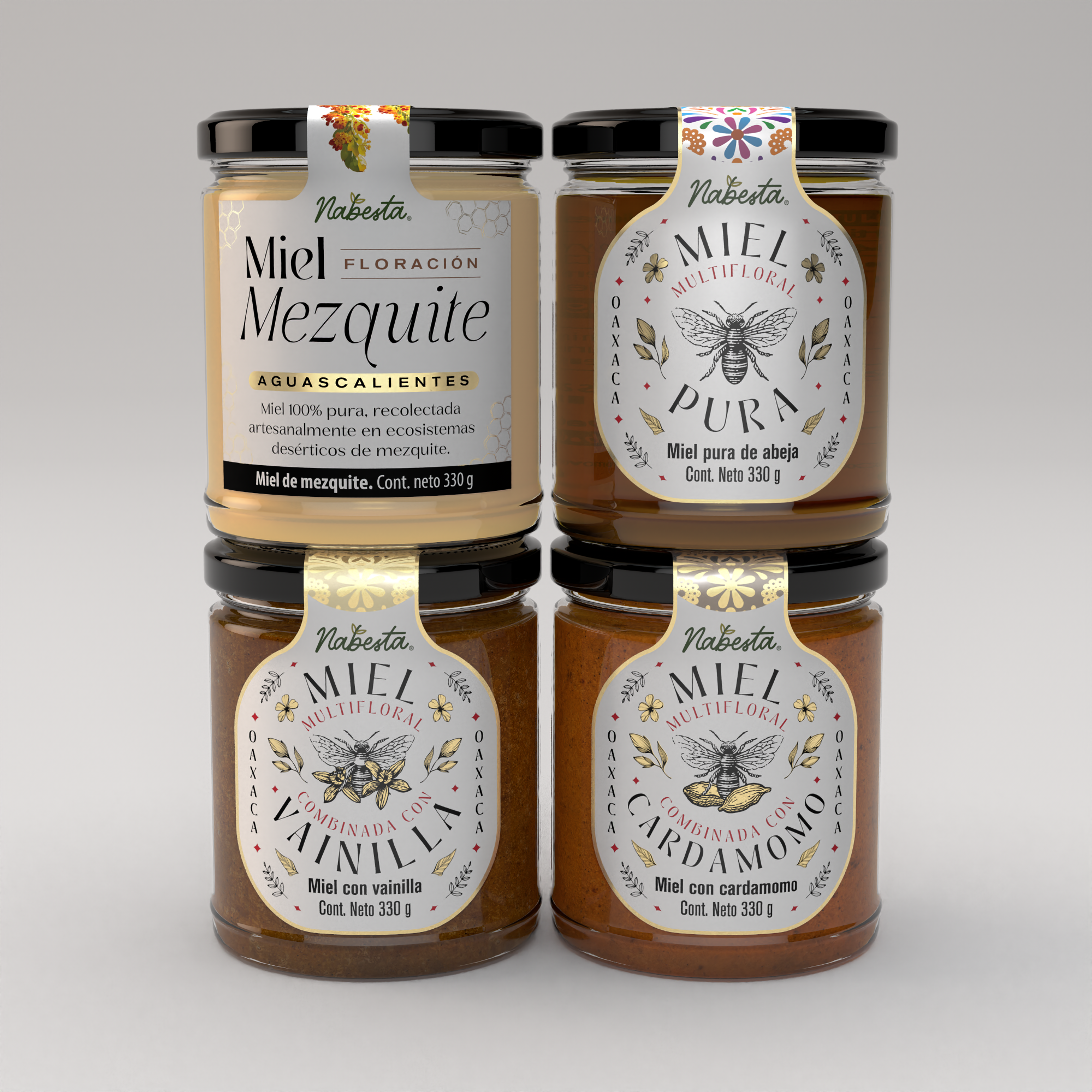 El Kit Nabesta Premium reúne una selección completa de nuestras mieles artesanales para quienes disfrutan descubrir perfiles únicos y naturales. Incluye: 🍯 Miel Vainilla (330 g) 🍯 Miel Cardamomo (330 g) 🍯 Miel Pura (330 g) 🍯 Miel Mezquite (330 g) Una experiencia gourmet ideal para regalar o disfrutar en familia.