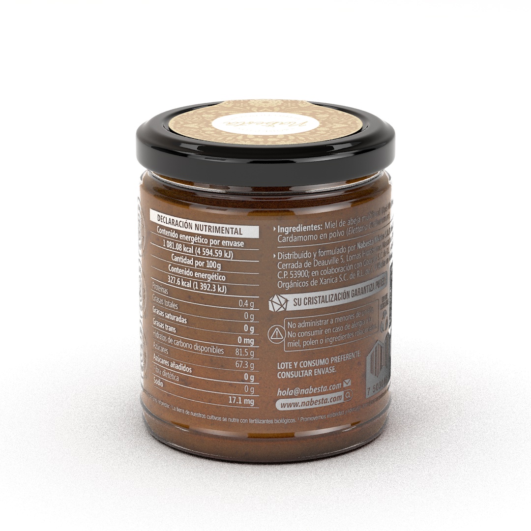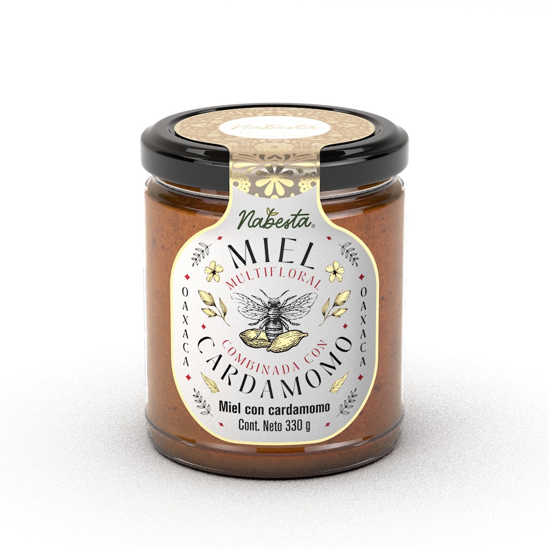 Presentación frasco de vidrio reciclable de 9 cm de altura x 7 cm de ancho. Contenido: Miel multifloral de las montañas de Oaxaca, combinada con cardamomo de origen agroforestal, cosechados eticamente por comunidades indígenas de México. Con cada frasco ayudas a reforestar y polinizar nuestros bosques. Propiedades: Miel aterciopelada que cristaliza por su pureza con notas cítircas que recuerdan a la menta. Las propiedades naturales de ambos, aportan antioxidantes, energía nutritiva y digestiva que desinflama.